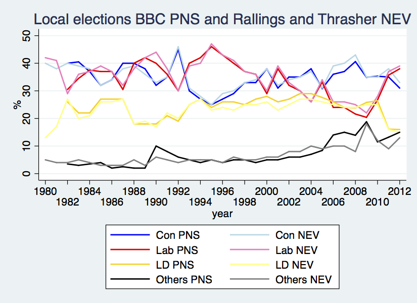 One thought on “Local Elections Vote Shares: the BBC PNS and Rallings & Thrasher NEV compared”