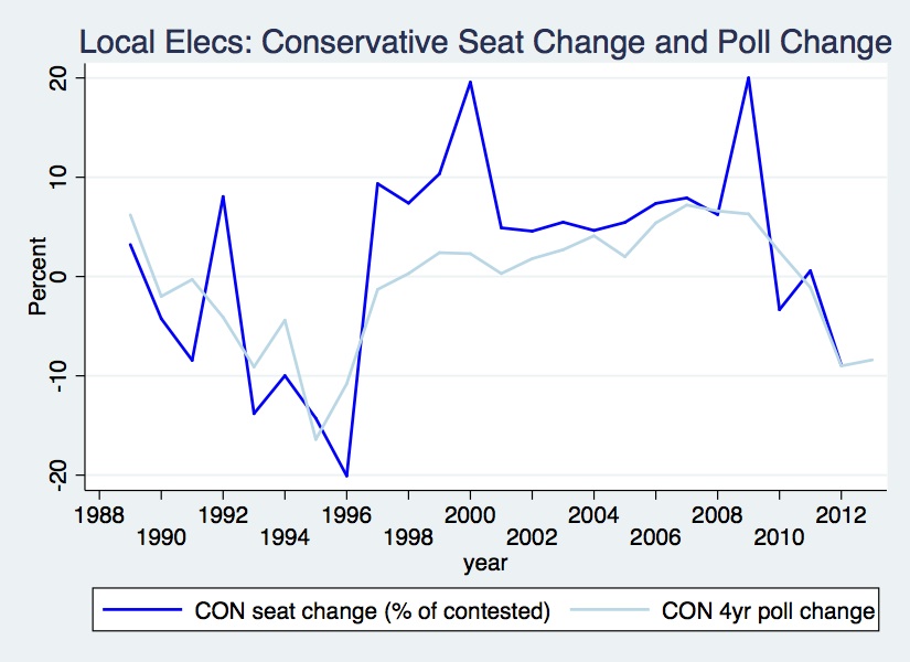 While some ask what local election results tell us about the state of the parties and prospects for the next general election, it is also important to consider how national party popularity affects the fortunes of candidates in local government elections. Local elections are often said to be about local issues but actually most of the changes over time in shares of council seats won the Conservatives, Labour and Liberal Democrats can be accounted for by changes the popularity of these parties at the national level.