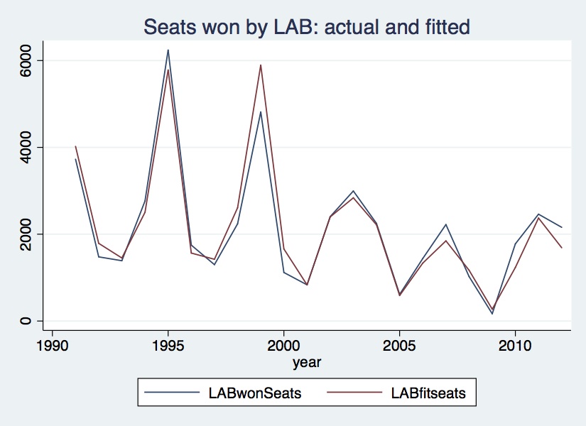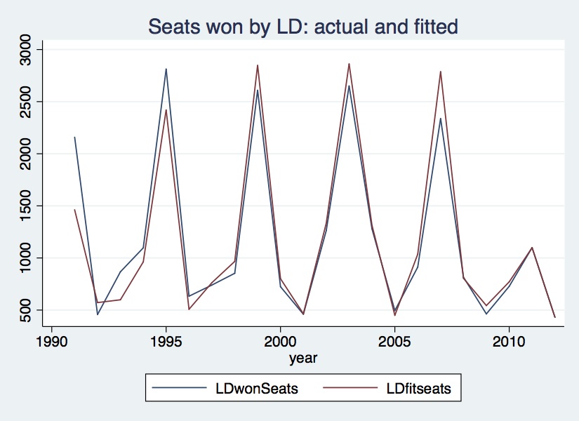 Predicted seats and actual seats won graphs are below. These look much better because the dependent variable seems to be adjusting relatively well for changes in the number of seats. But notice that the gaps are in the hundreds sometimes. This is salutary reminder that the political significance of numbers of gains and losses depends very much on the numbers of seats up for election. The median absolute error on seats is 150 for Con and Lab and 97 for LD. There are some signs of better fit in recent years, but there are some spectacular failures with some fitted values being over 500 seats out.