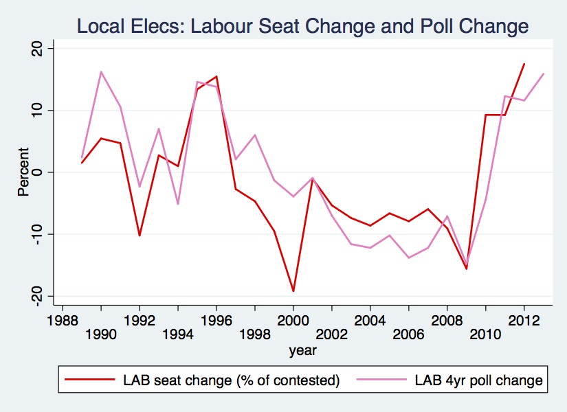 I suspect both predictions for the Conservative losses are too low. Note from the graph above that 2009 was a year in which the Conservative local election performance was well in excess of what you would have expected given their standing in the opinion polls. On the same day as the 2009 local elections, UKIP were the second largest party in European elections. But the party didn’t field many candidates in 2009, probably benefiting the Conservatives. Today UKIP are contesting about three quarters of council seats, and opinion polls suggest they may gain as much as 20% of the vote, mostly at the expense of the Conservatives. So the Tories are defending an unusually strong 2009 result and face a much greater challenge than can be accounted for by the opinion polls statistical model. Conservative losses in the order of 400 seem more likely.