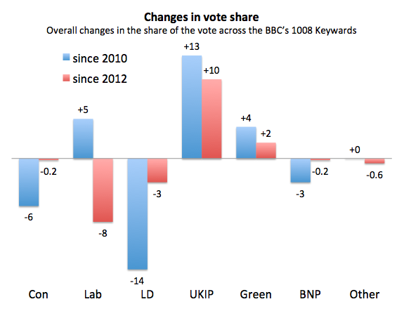 The story about change since 2012 also in the table is also revealing here. That shows much more clearly how Labour have fallen and UKIP risen in local election vote shares over the last two years. What seems to have happened is that between 2010 and 2012 UKIP took votes mainly from the Conservatives, but between 2012 and 2014 they have had more success in attracting Labour voters. The net effect is that the UKIP rise from 2010 to 2014 has been at similar expense to Labour and the Conservatives.