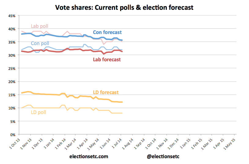 The Liberal Democrats were steady in the polls at 10% but have dropped a bit to 8% since the local and European elections. So their forecast general election share has declined from 16% to 12%.