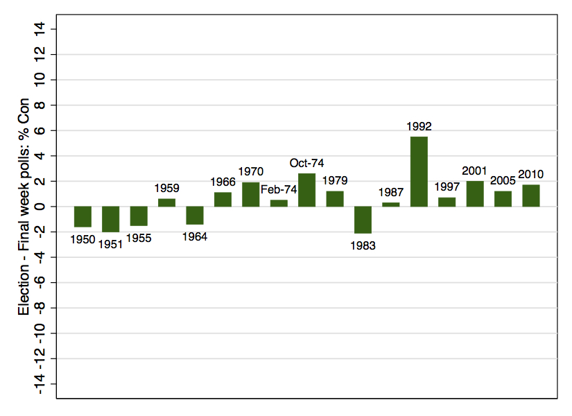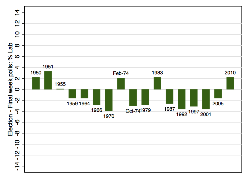 The graphs for election results relative to final week polls – plus the experience of polls for the European Parliament elections last year – suggest that the polls may be generous to Labour and underestimating the Tories again this year. But it would be unwise to rely on it.