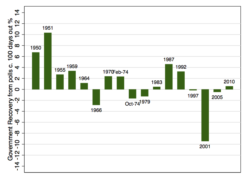 This week we passed the ‘100 days to go’ mark, so it’s perhaps a good time to reflect on the general approach of our forecasting model for the share of the vote. The analysis of historical polls and votes still suggests government recovery and opposition setback from 100 days out, on average. But there is a lot of noise around the average.