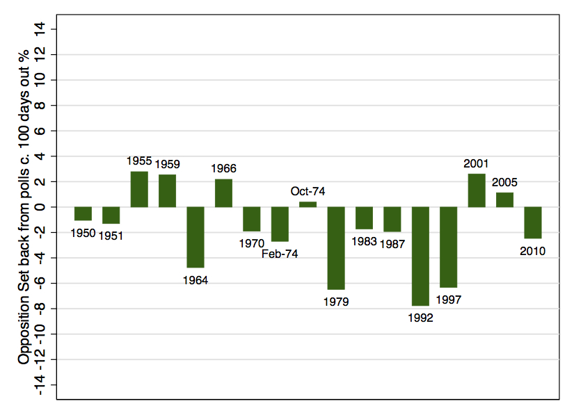 The opposition setback effect has been reasonably consistent since 1970, but the government recovery from this point in the cycle has not been so reliable in more recent elections. A large part of the average government recovery from c.100 days out is driven by the elections in the 1950s.