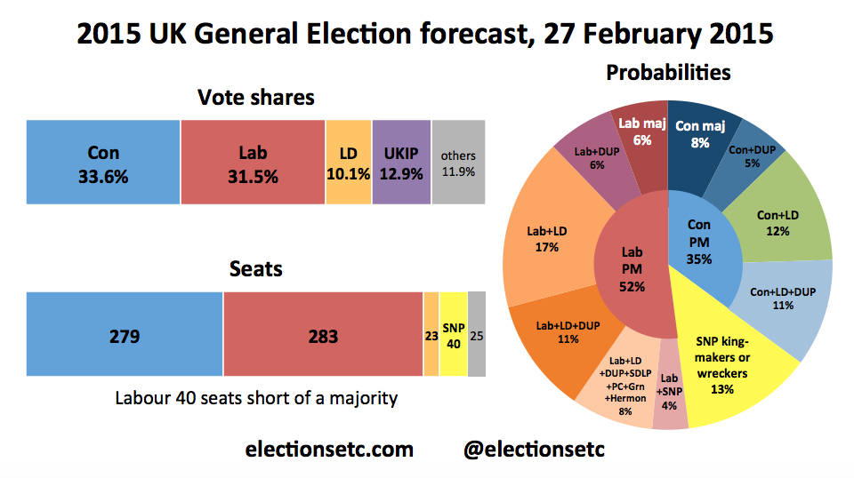 First, there’s a 3.5% chance that Labour have the most seats and a Lab-SNP alliance would yield a majority (without the others). Under these circumstances, Ed Miliband might well be able to cut a deal with Nicola Sturgeon and Alex Salmond that would put him into Number 10. But it will still be difficult for the two parties to resolve their difference on Trident and the moral force that goes with Labour winning most seats will be tempered by having fewer votes than the Tories.