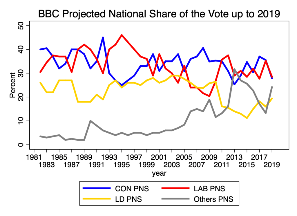 In what Peter Snow often described as ‘just a bit of fun’, the PNS is also used to estimate the composition of the House of Commons in a contemporaneous general election. This estimate is simply a statement of what the outcome in seats would be if the changes in party support implied by the PNS since the last general election were to be replicated across the country as a whole.