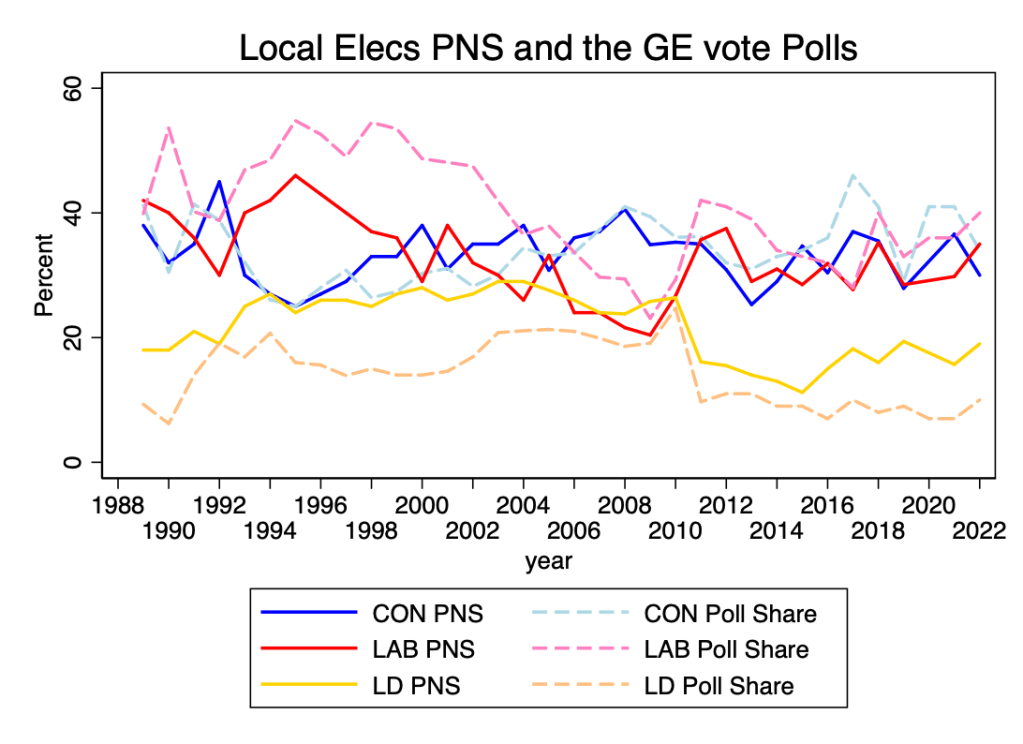 Historically, party performance in local elections has followed a similar pattern of change over time to the general-election vote-intention opinion polls, as shown the graph below.