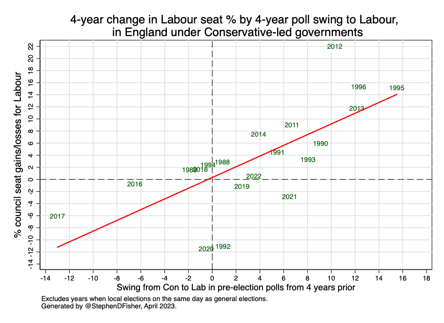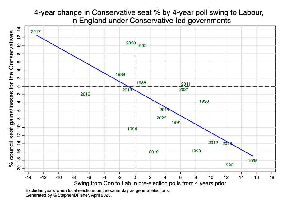 On the other hand, what Colin Rallings and Michael Thrasher said in their preview suggests the electoral system may work especially strongly against the Conservatives this time: “taking the likely previous outcome in newly drawn wards into account, a 6% swing from the Conservatives to Labour since 2019 could see Conservative seat losses breaching 1,000 with Labour registering 700 or so gains.” My macro models suggest a similar swing would yield less than half that number of Conservative losses. Since they have the data to take boundary changes and previous ward level vote shares into account, that comparison seems to imply the electoral system will exaggerate the swing against the Conservatives more than normal, as it did in 1995.