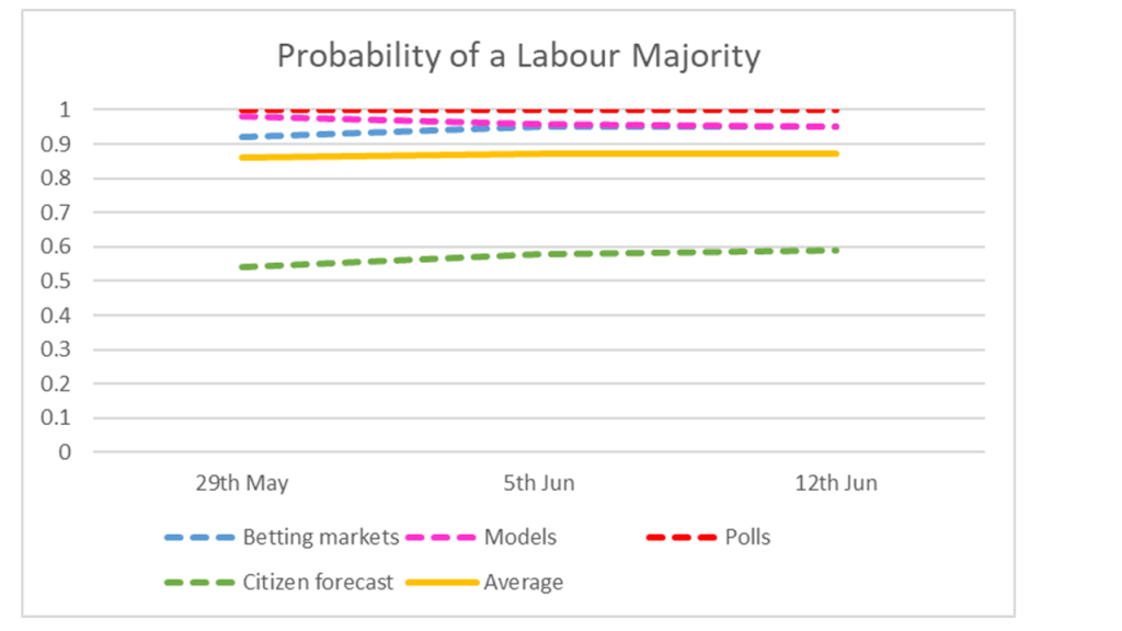 Table 2 shows estimates of probabilities and pseudo probabilities for different election outcomes. Averaging the different sources suggests a 94% chance of a Labour government and an 87% chance of a Labour majority. Practically no change since last week. Sadly, no new citizen forecast polls that we could find this week. We did take out two old ones (from early May), which made little difference.