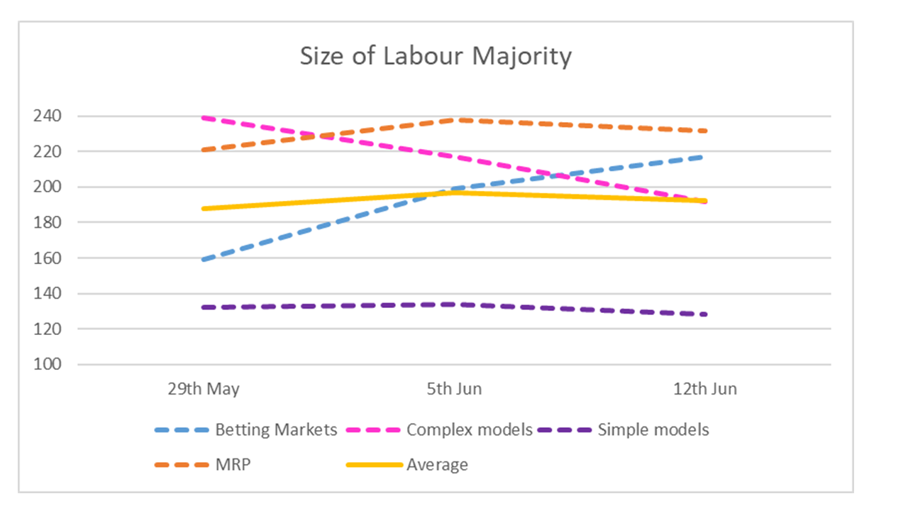 Figure 1 shows how the forecasts of the size of a Labour majority have changed since the start of the campaign. The downward trend for the complex models is largely due to the addition of new models over time. The betting markets seem to be increasingly convinced by the MRP forecasts.