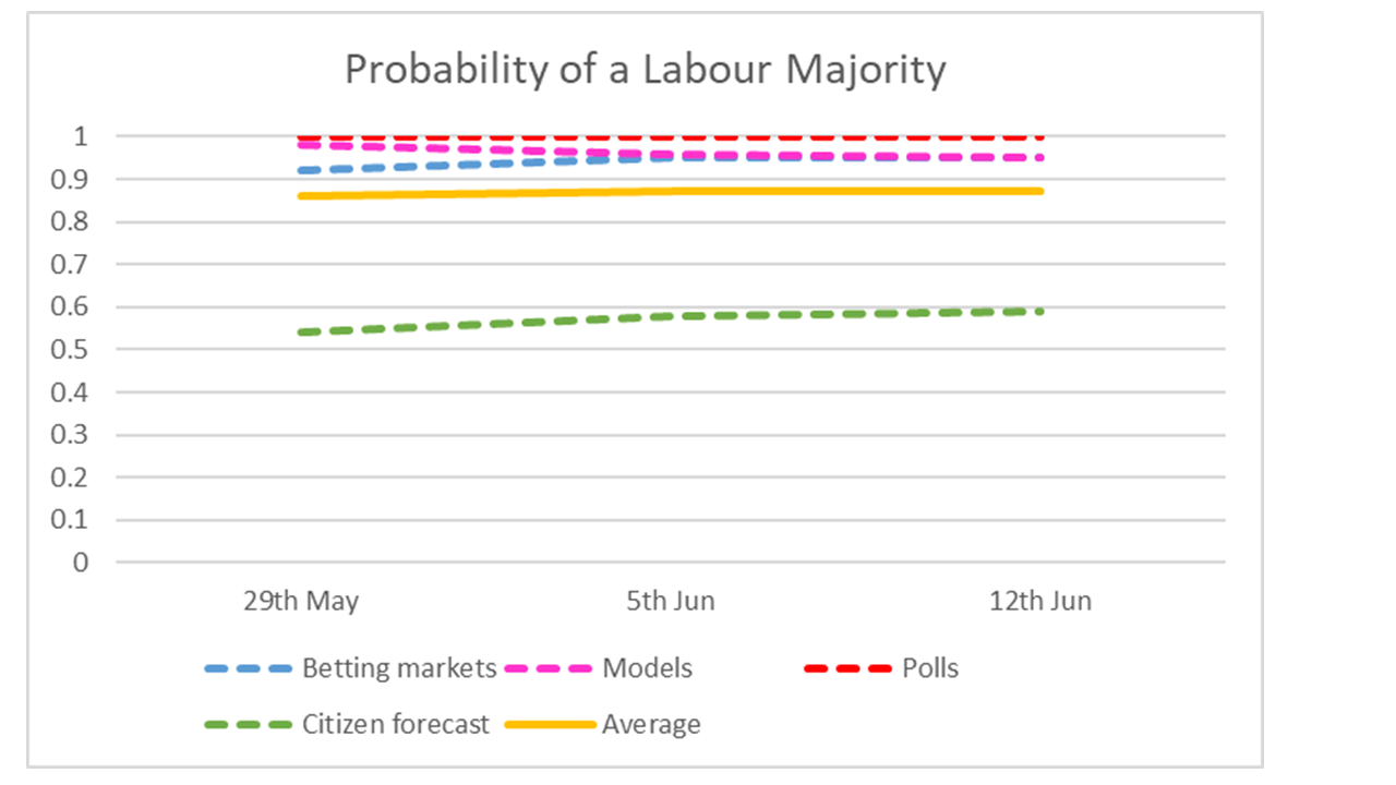 Figure 2 shows how stable the predicted probabilities of a Labour majority have been since the start of the campaign.
