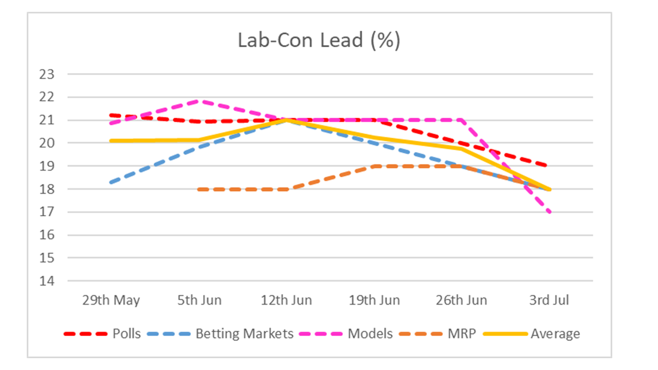 | Poll aggregates | Betting markets | Models | MRP | Average | |