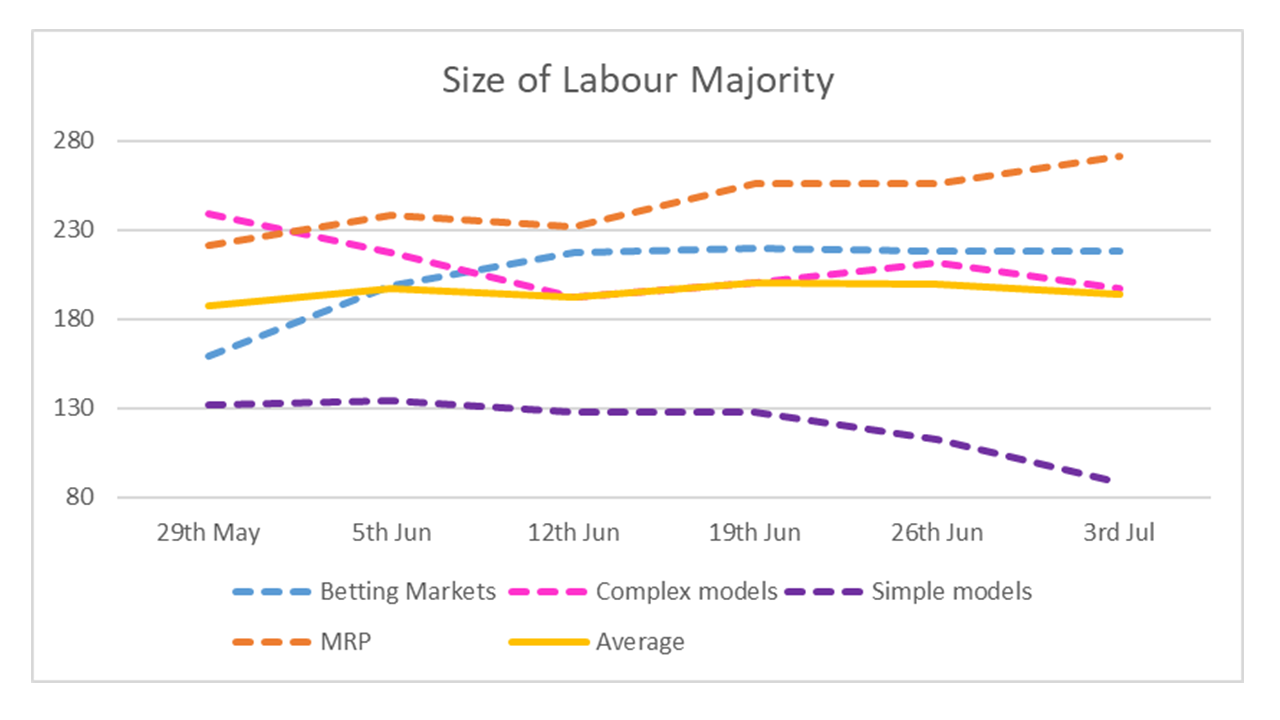 Figure 1 shows how the forecasts of the size of a Labour majority have changed since the start of the campaign.