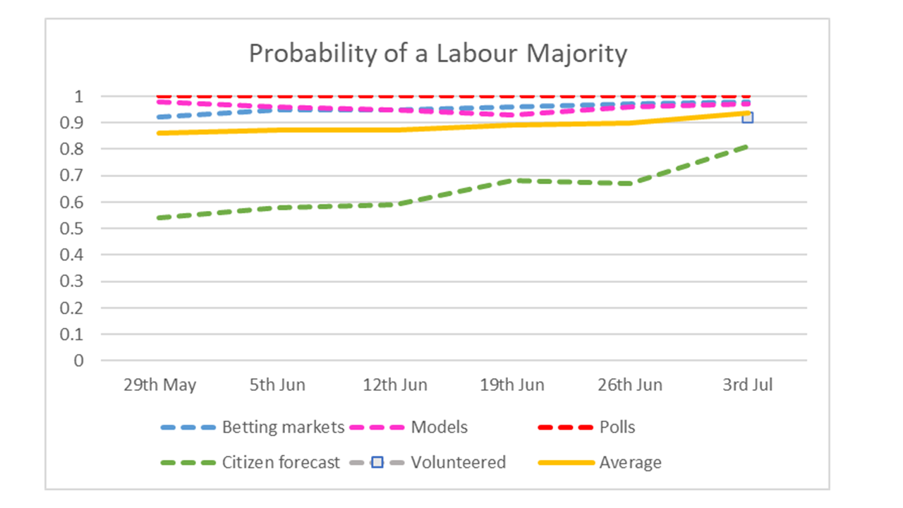 Figure 2 shows how stable the predicted probabilities of a Labour majority have been since the start of the campaign. The remarkable movement in the citizen forecasts have been partly due to different combinations of polls being available.