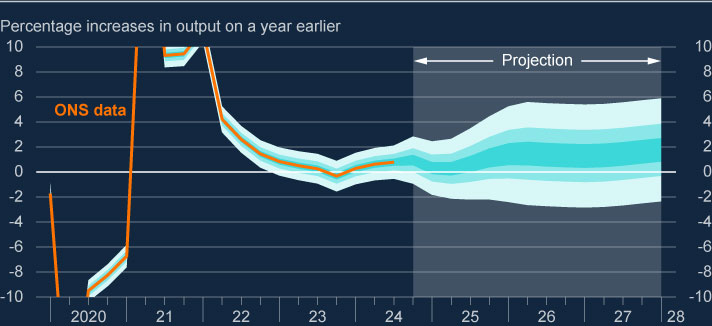 Economic anxiety is unsurprising given the poor performance of the UK economy. Yesterday the Bank of England announced that “UK GDP growth is estimated to have been zero in 2024 Q3, [and] projected to have fallen by 0.1% in Q4,” and to rise by 0.1% in 2025 Q1. Given the uncertainty in those estimates and projections (as evident in the Bank’s chart for annualised growth below) there is a high probability (close to 50%) that the UK has been in a recession since October. That is to say, there is a fair chance final figures will show GDP drops in both the final quarter of 2024 and the first quarter of 2025. Even if we are not in a recession now, the uncertainty in forecasts for future GDP figures mean a high risk of a recession before the next election.